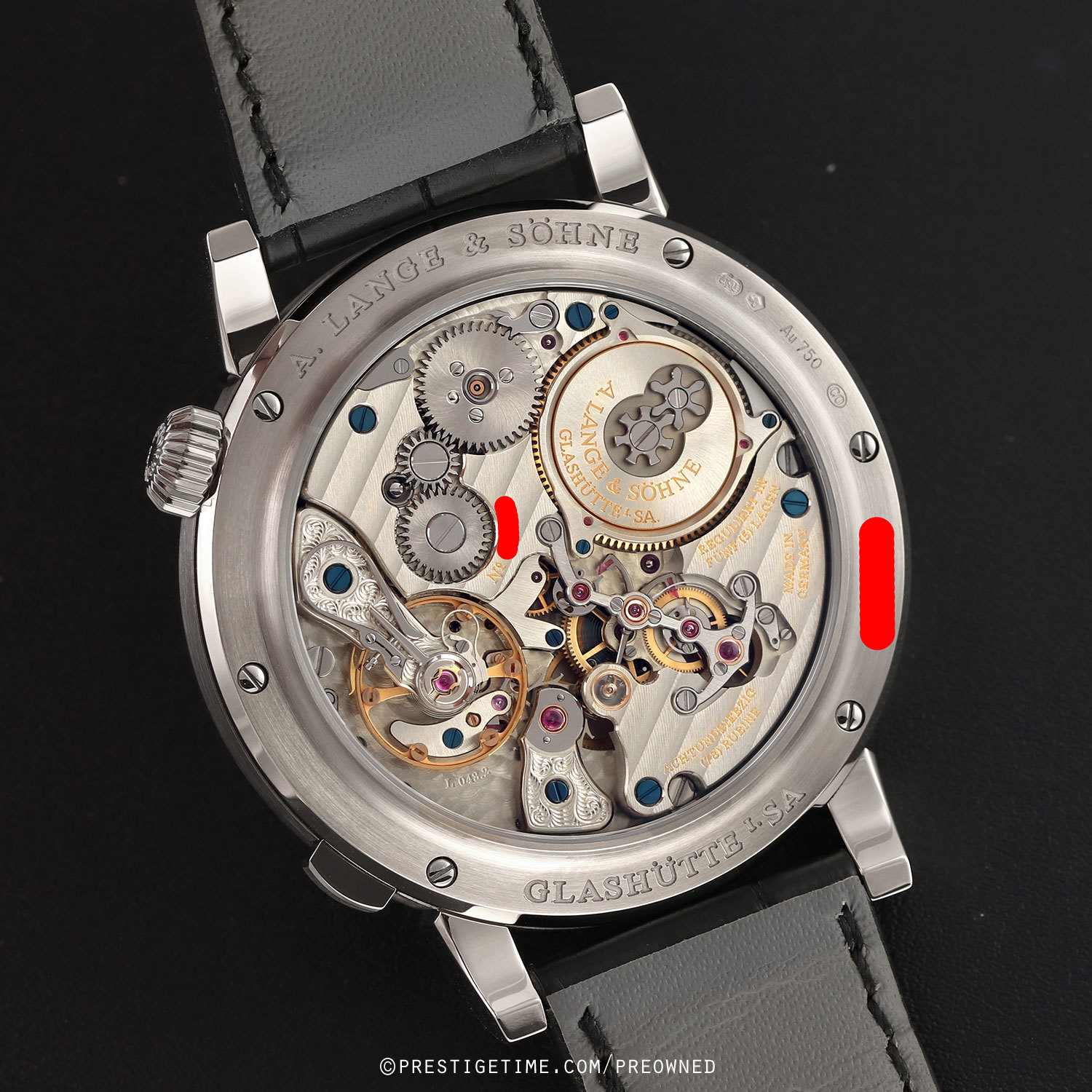 Movement: Powered by an A. Lange & Sohne in-house caliber L043.2, beats at 18,000 vph (2.5Hz), composed out of 528 parts, contains 78 jewels & has an power reserve of 36 hours.