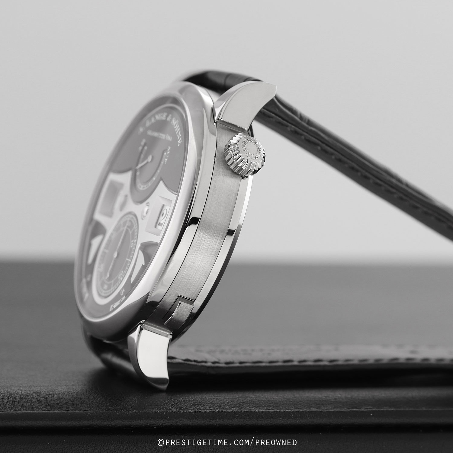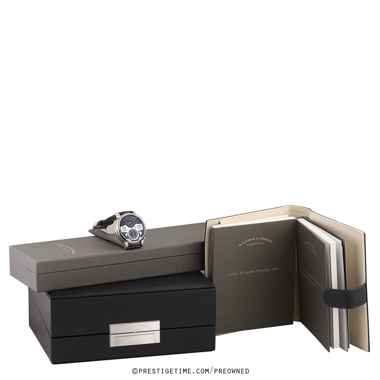 Condition: This watch is excellent pristine near-new condition. The watch came back from a complete factory service (Germany) in late January 2025. As part of the service the watch was completely overhauled, polished/refinished by Lange & a fitted with brand new original strap. The watch has not be worn since it has been returned from service. We would be comfortable rating this watch in 98%+ condition. Delivered in its original box with all original papers. A copy of the factory service receipt & a factory branded service box is included.