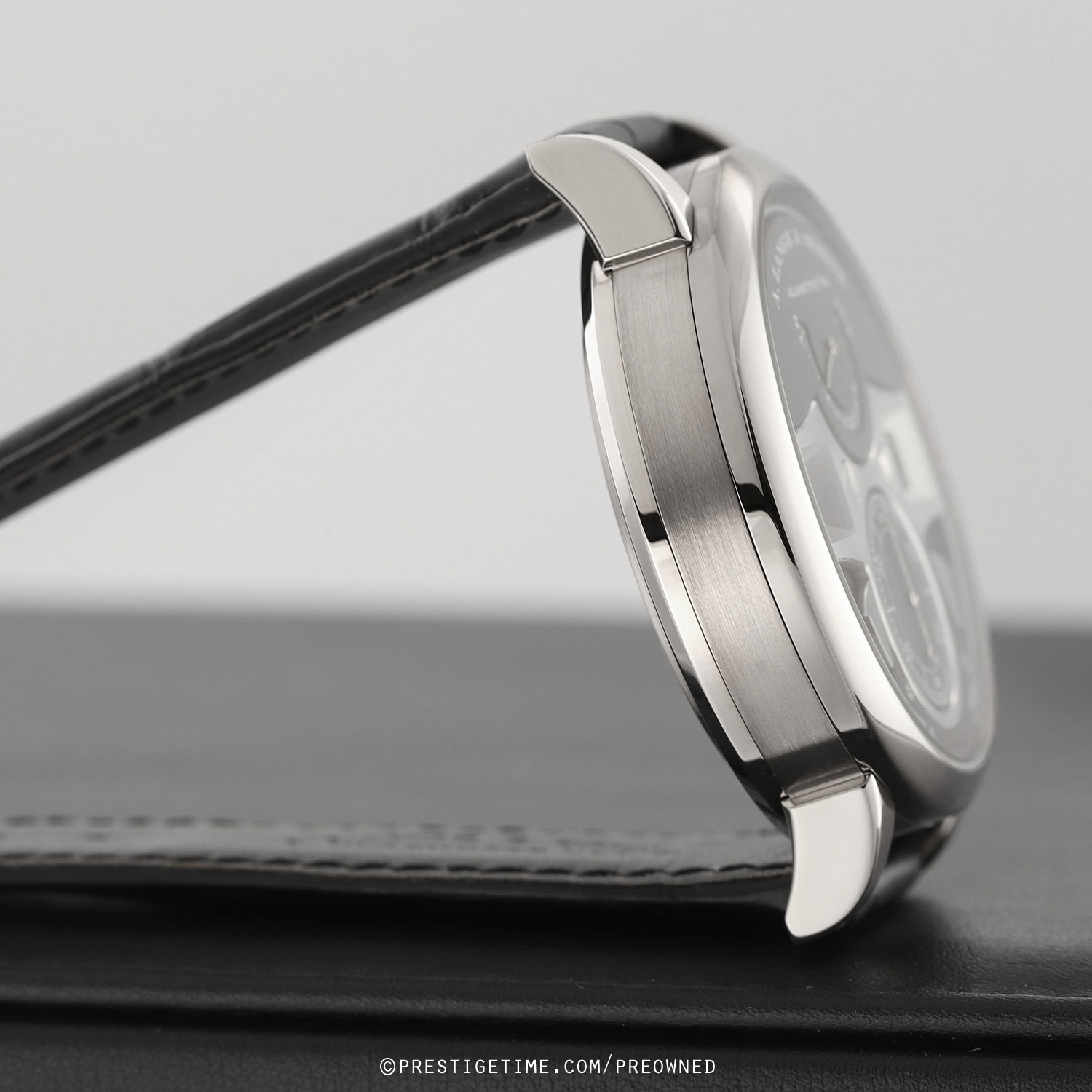 Case: Brushed & polished 18kt white gold case. Matte black dial with a brushed & polished German-Silver movement bridge framing the hours/minutes/seconds displays. Polished white gold hands for seconds & power reserve indicators.