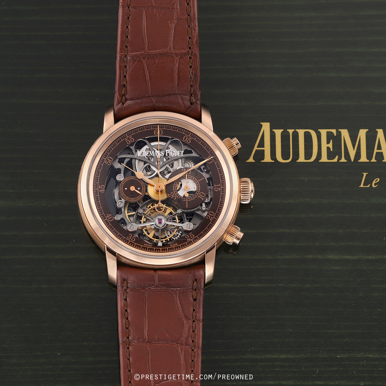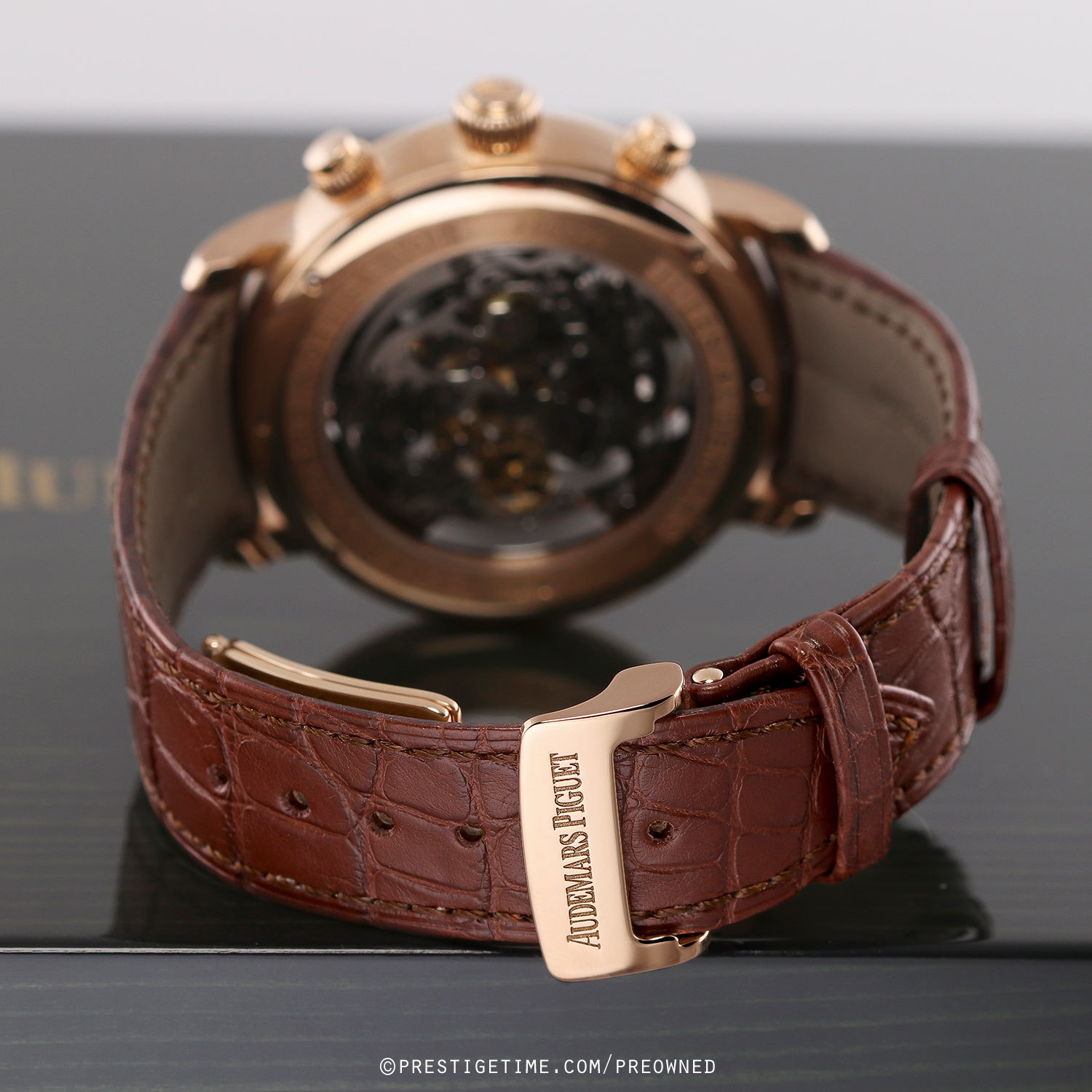 Strap: Fitted on its original Audemars Piguet brown alligator leather strap with a solid 18kt rose gold AP design deployant buckle. The strap is in new & unworn condition with its full wear lifespan remaining.