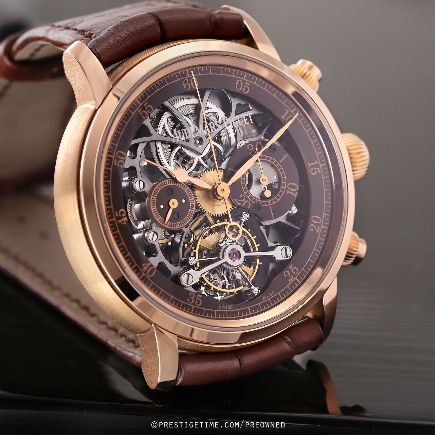 Case: Brushed & polished 18kt rose gold case. Skeleton main dial with black finished movement bridges & mainplate. Dark brown sub-dials & dial flange. Polished rose gold hands. Fine printed minutes/seconds & fractions of a seconds track. Small seconds sub-dial at 9 o'clock.