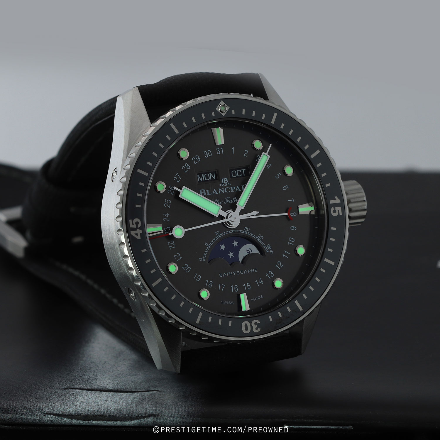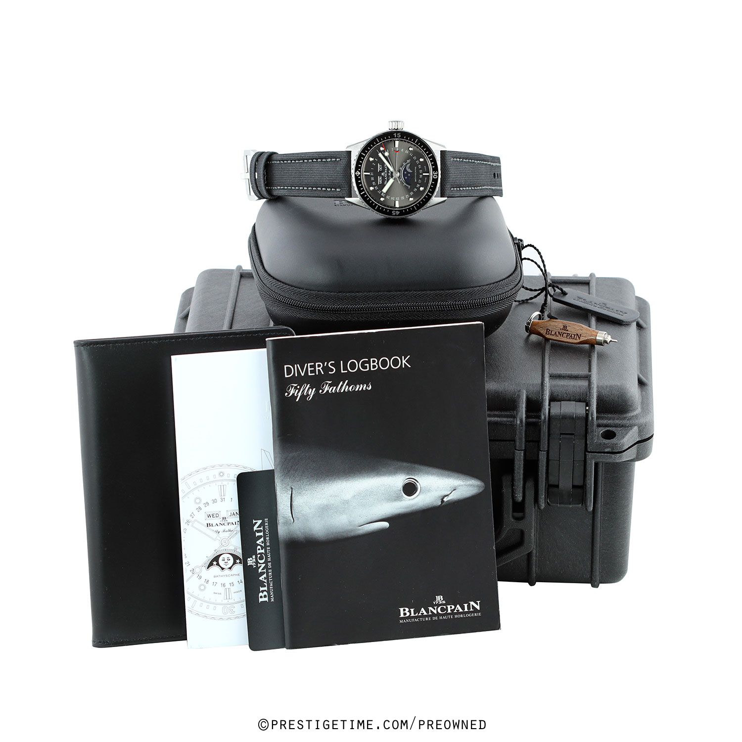 Condition: This watch is in excellent near-new condition. The watch completed a full factory service in early September 2025 and has not be worn since the service was completed. The watch has been lightly polished to remove most signs of wear. We would be comfortable rating this watch in 97%+ overall condition. The watch is delivered in its original Blancpain branded 9" x 7" x 4" genuine Peli water resistant carrying/storage case and includes all papers. A copy of the factory service letter & a branded Blancpain service pouch is included.