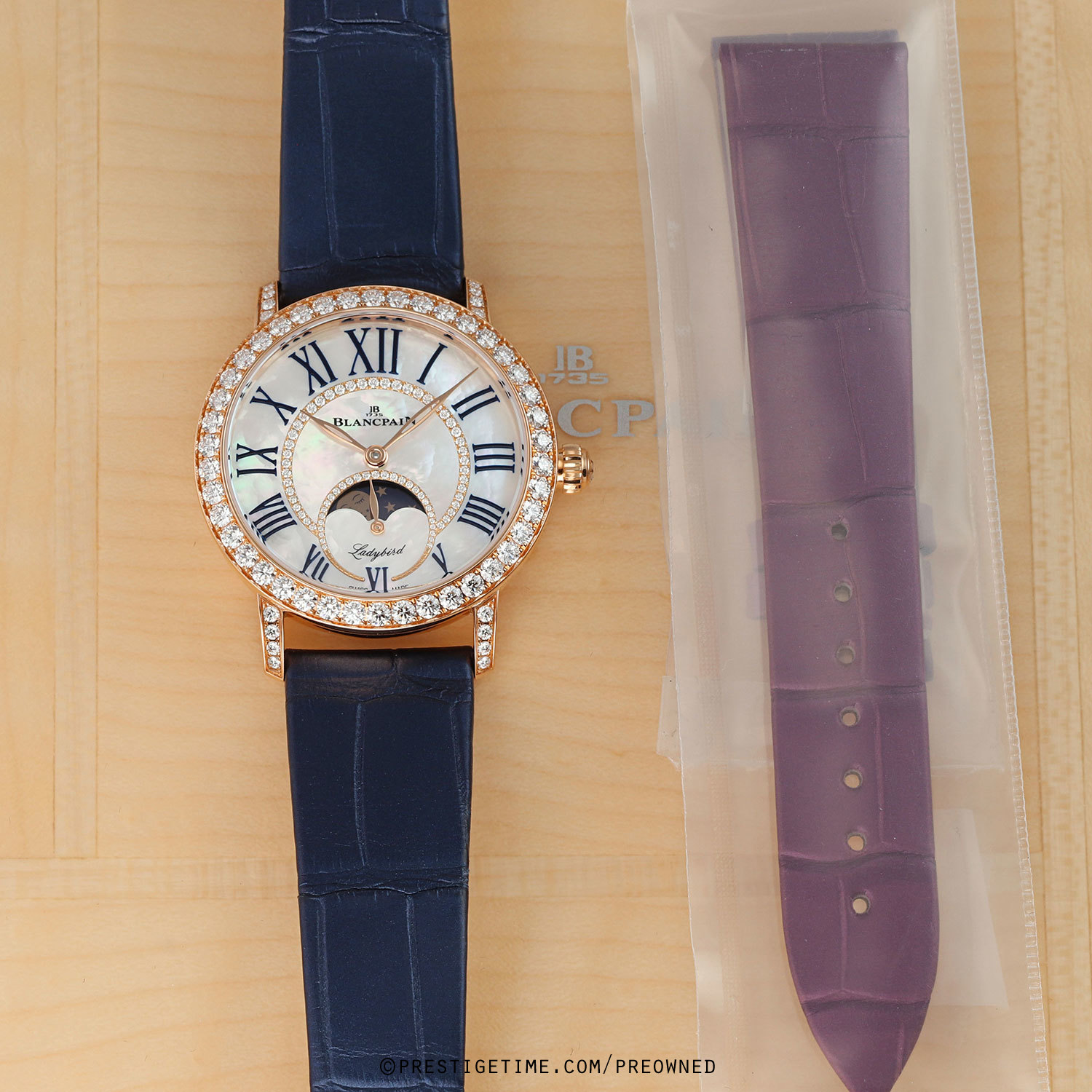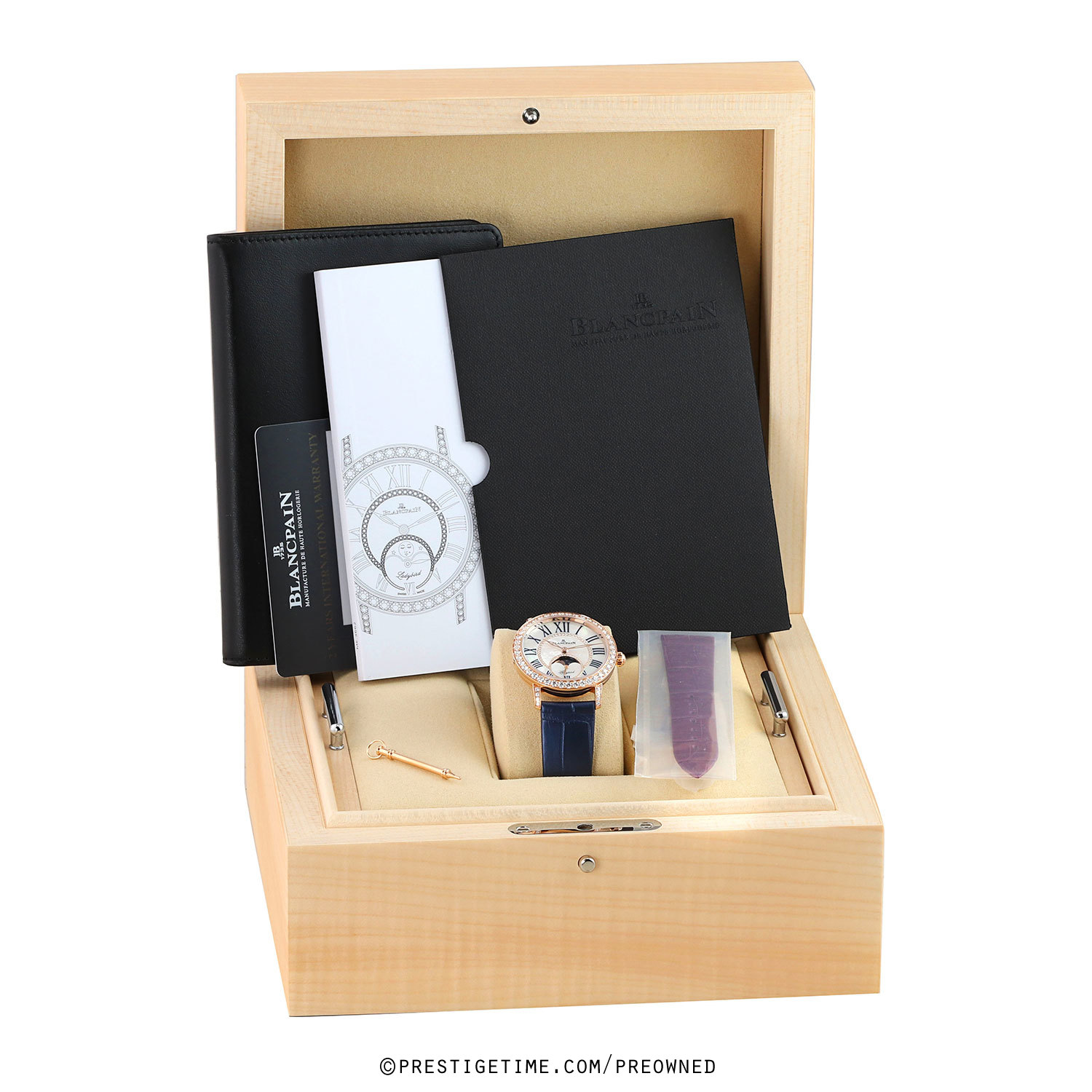 - Delivered with an additional Blancpain original purple-lilac colored alligator leather strap. This strap is brand new & unworn with its full wear lifespan.