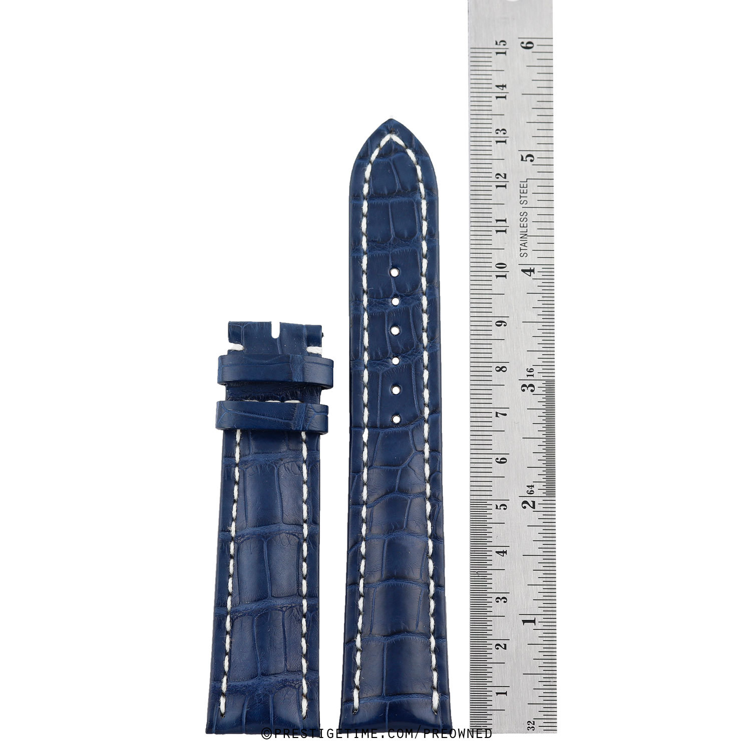 Genuine Breitling LONG blue alligator strap with white stitching for pin buckle.