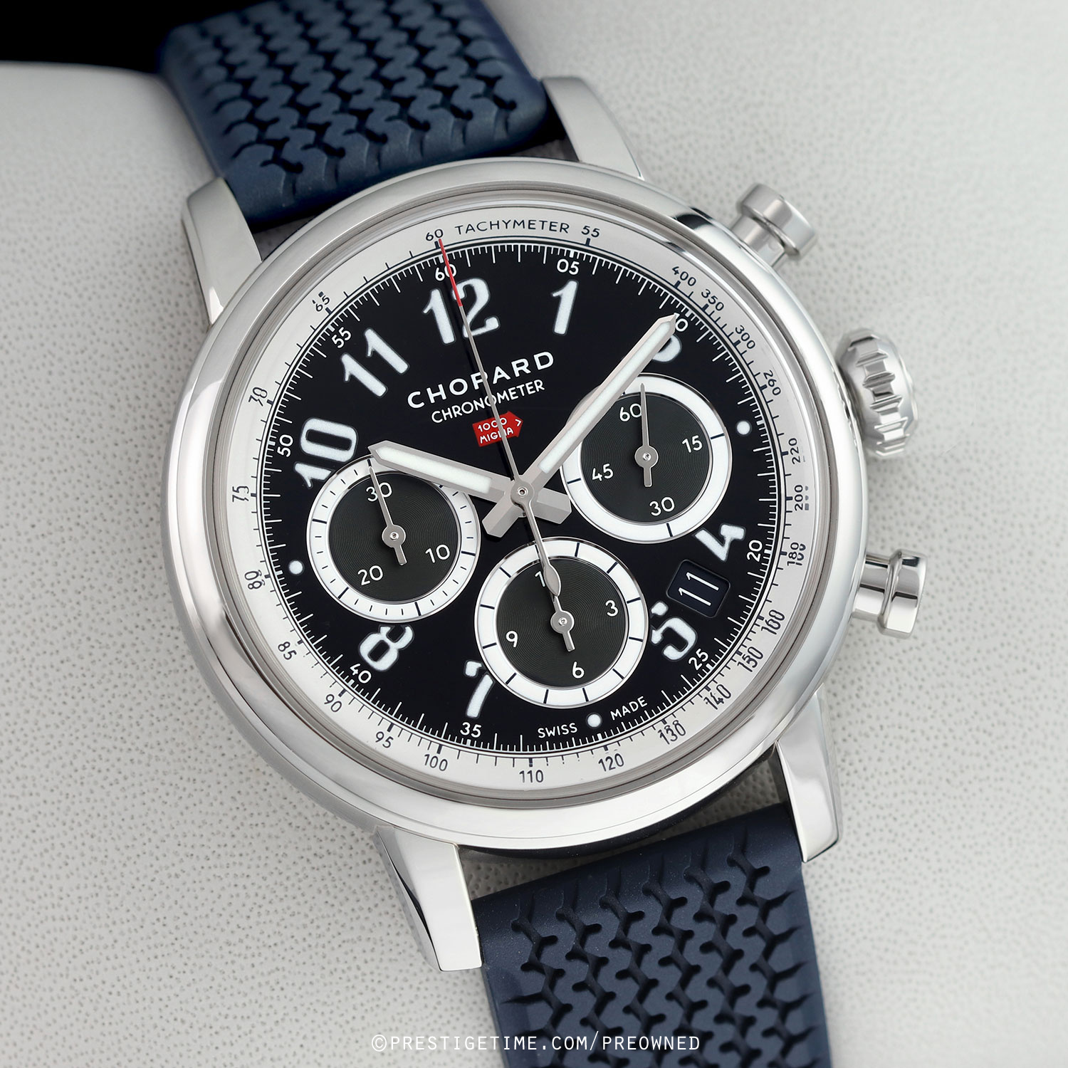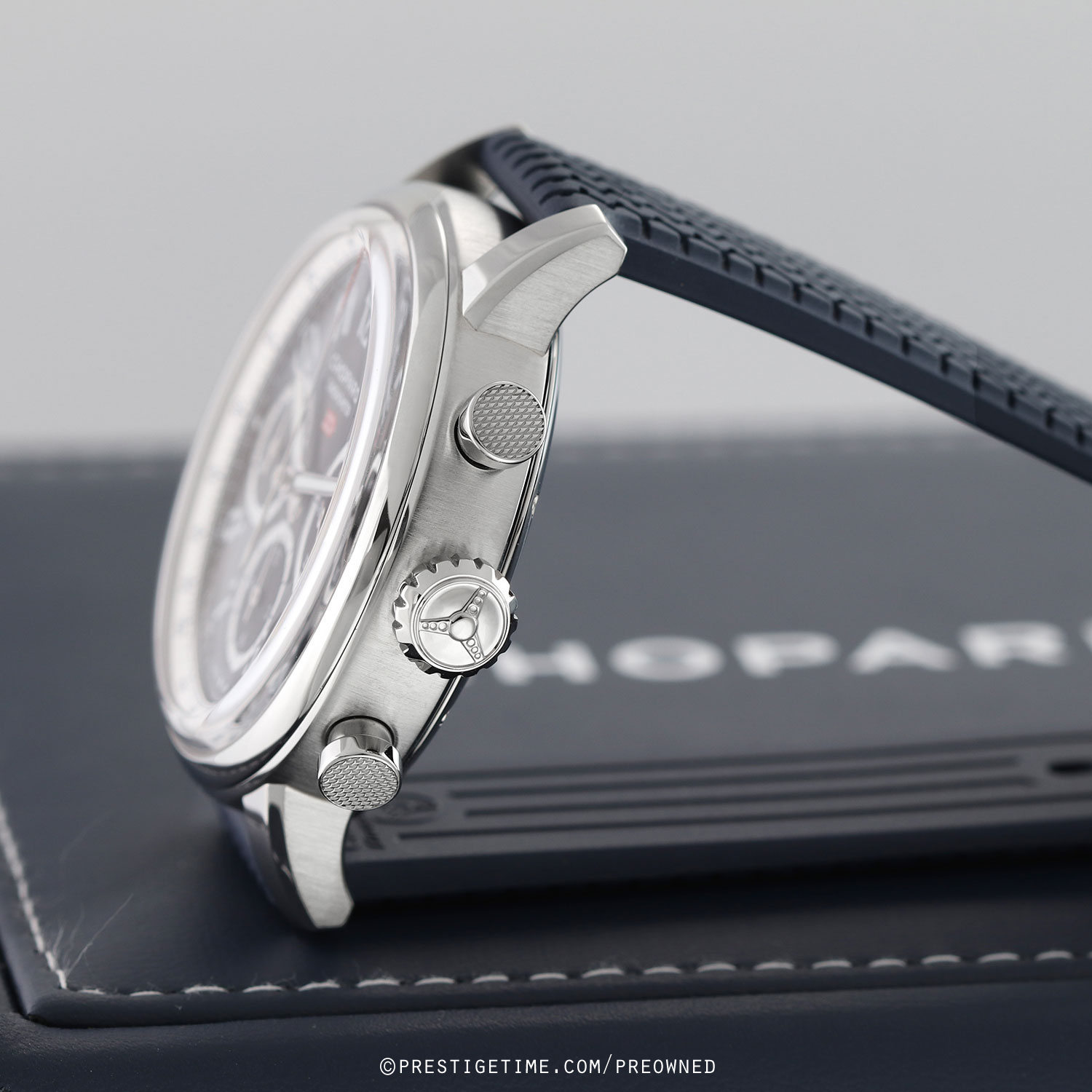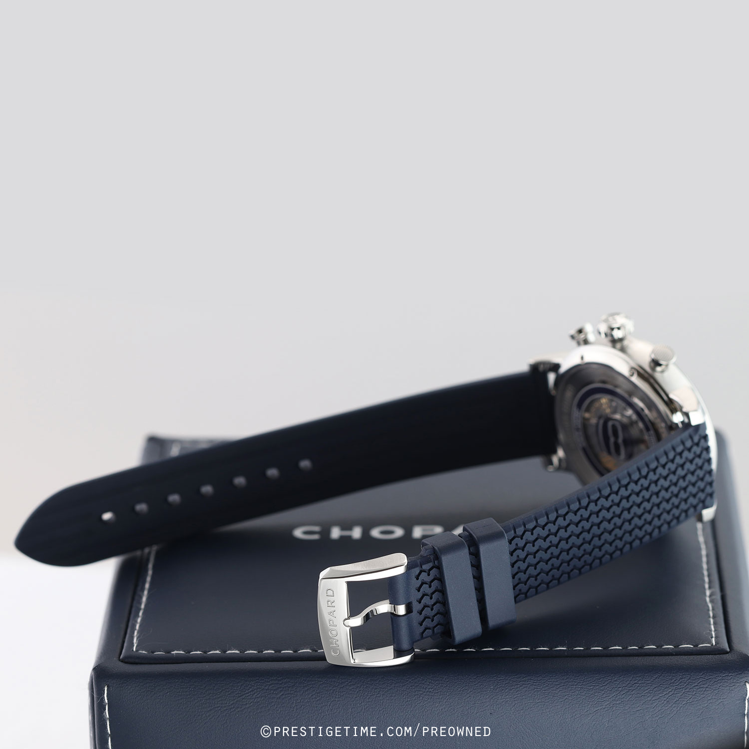 Strap: Fitted on its original Chopard dark blue rubber tire-tread style strap with a stainless steel tang buckle. The strap is in excellent near new condition with its full wear lifespan remaining. We would grade this trap in 98%+ condition.