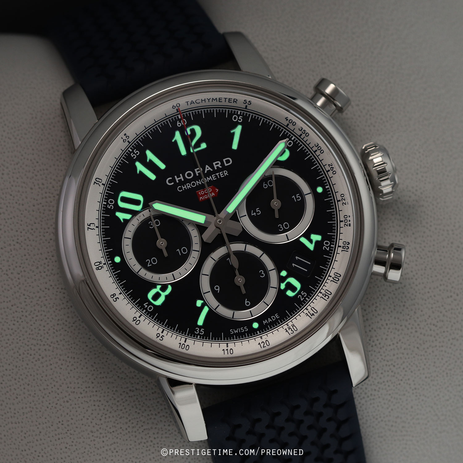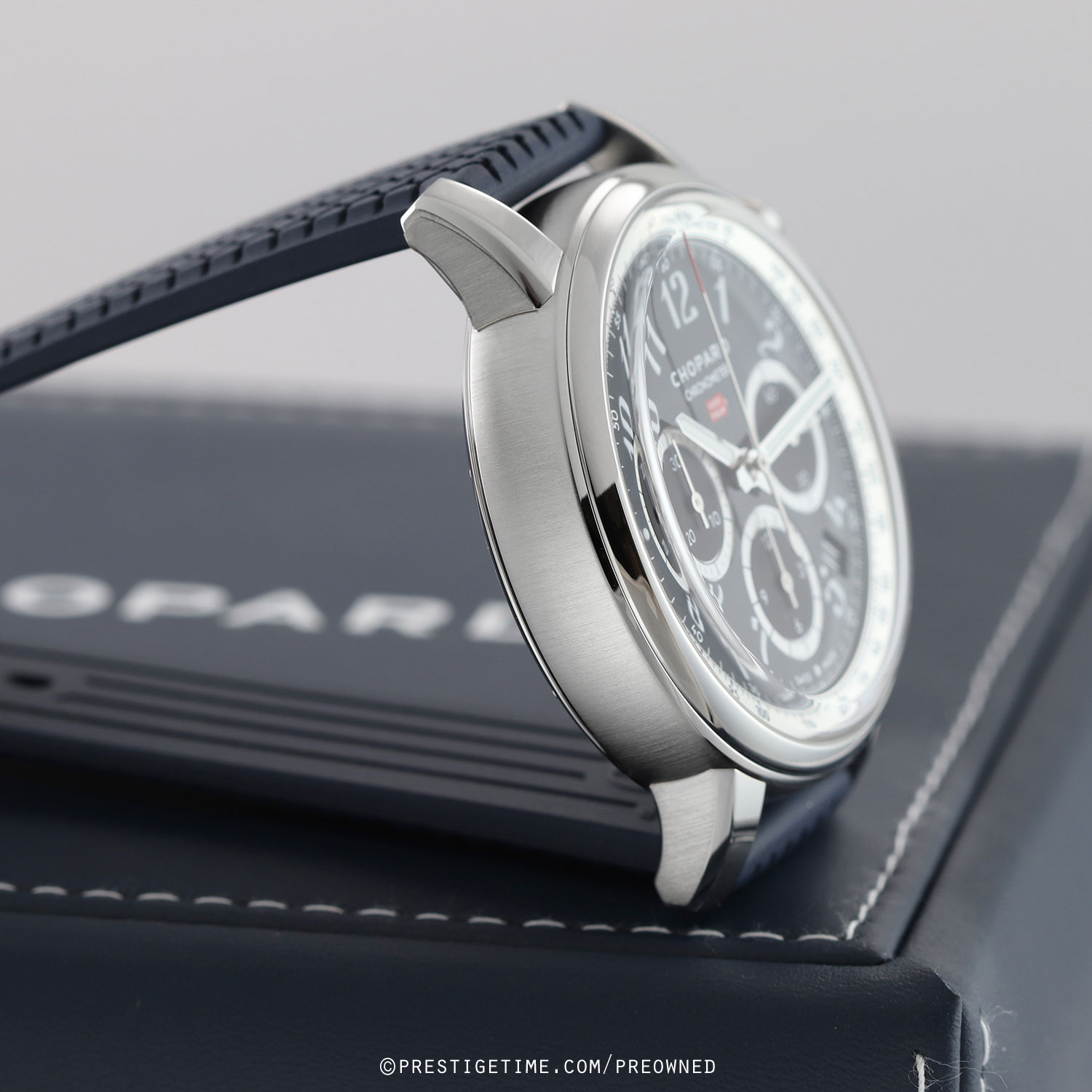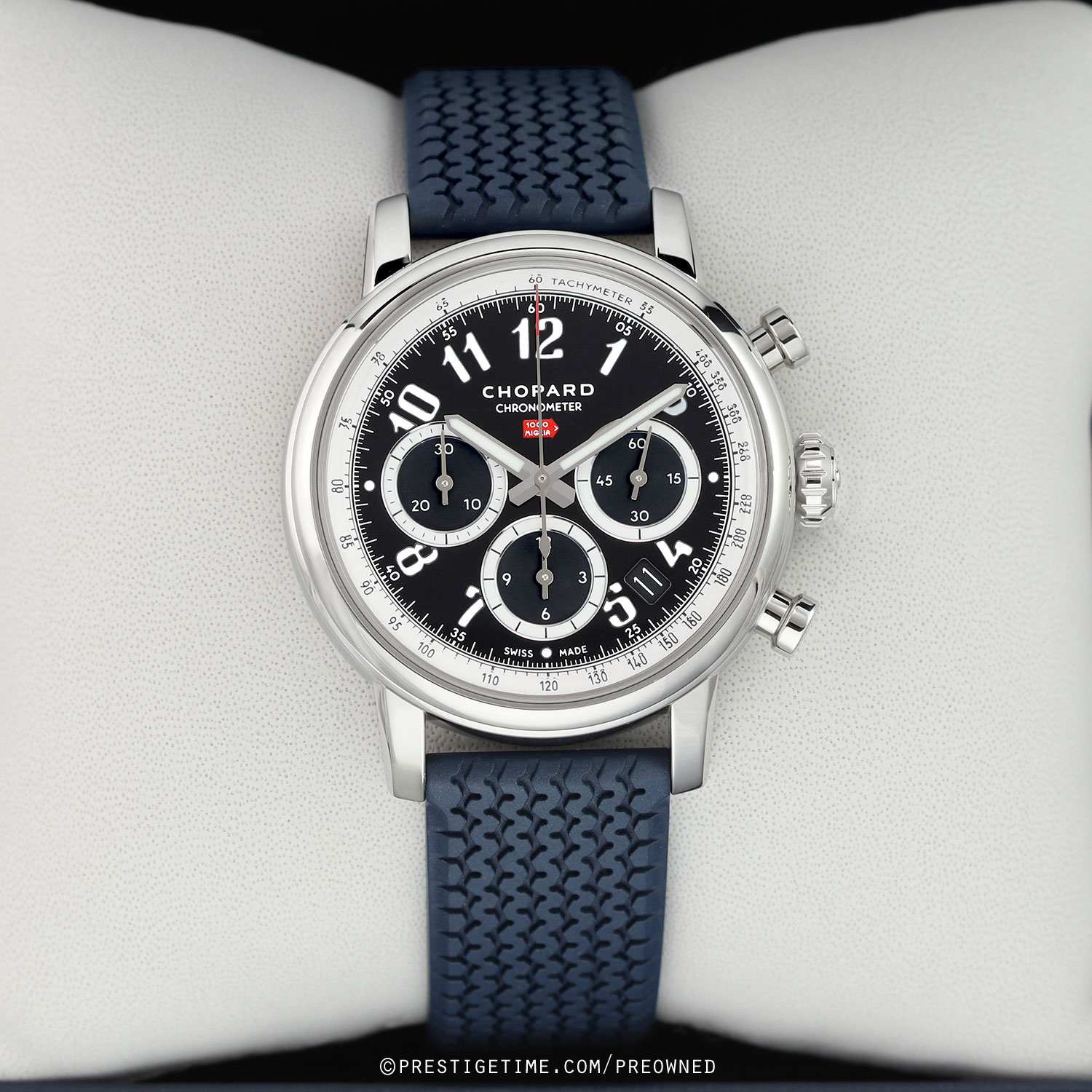 Strap: Fitted on its original Chopard dark blue rubber tire-tread style strap with a stainless steel tang buckle. The strap is in excellent near new condition with its full wear lifespan remaining. We would grade this trap in 98%+ condition.