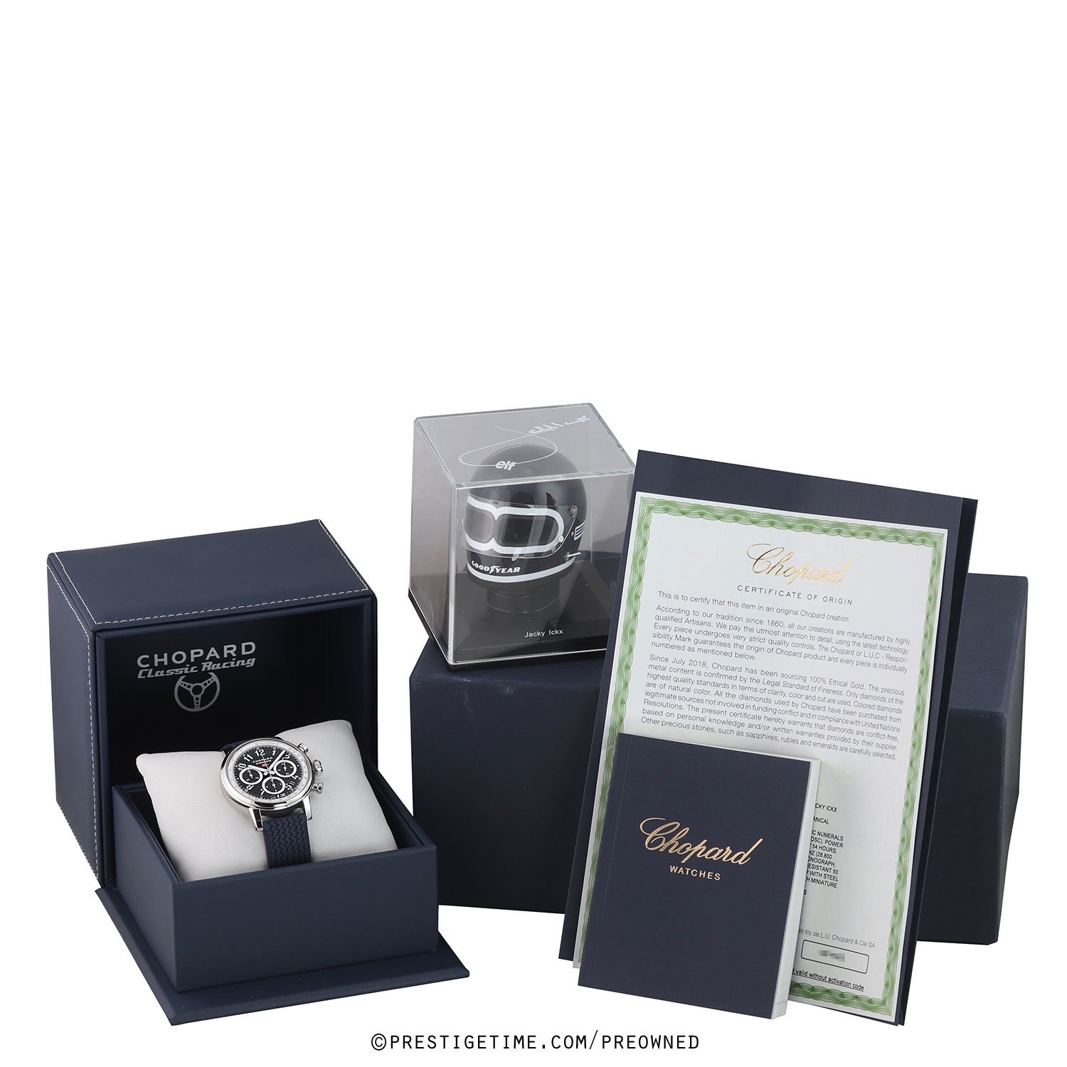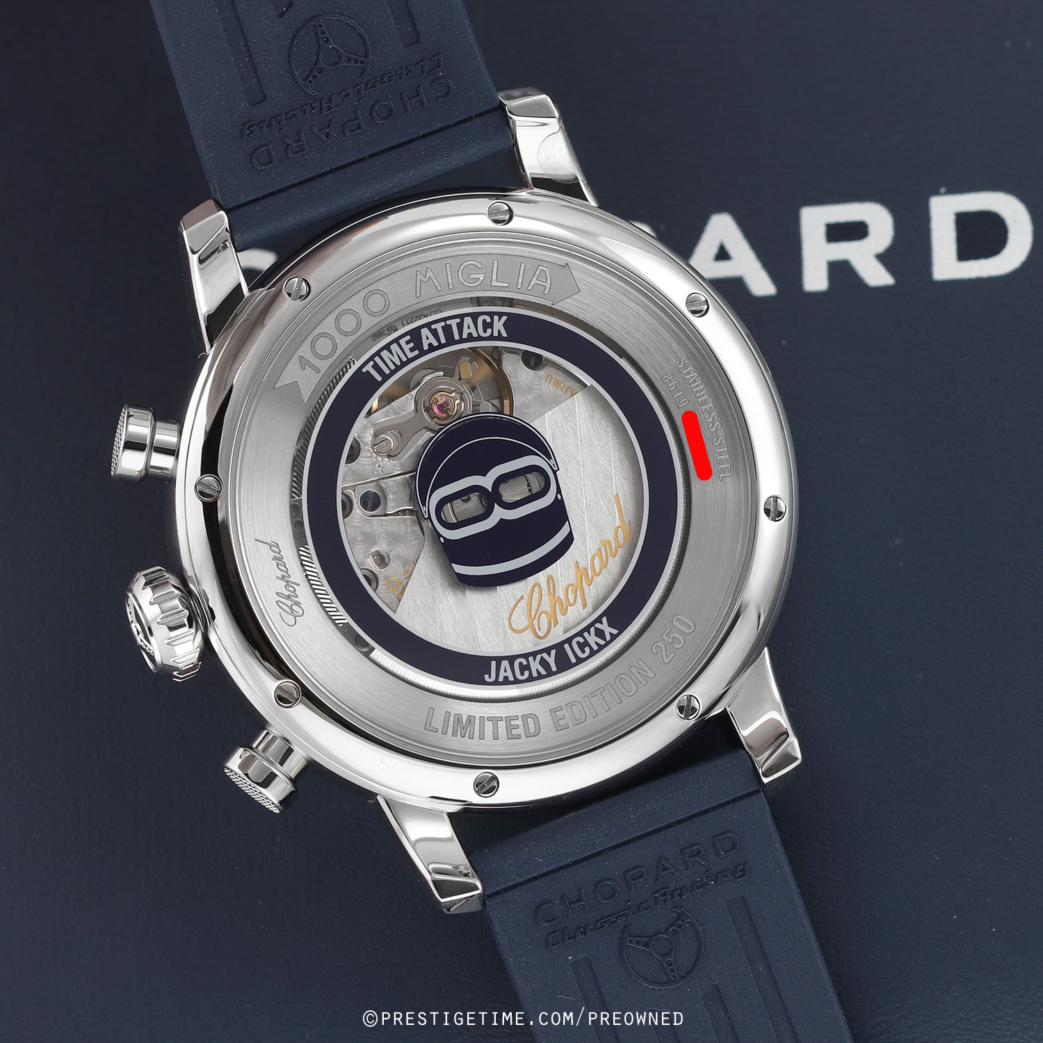 Chopard Mille Miglia Classic Chronograph JX7 Jacky Ickx – limited edition of 250 pieces. Created in honor of six-time Le Mans winner Jacky Ickx. The sapphire case back features his signature midnight blue “owl” helmet with “Time Attack” and “Jacky Ickx” printed on the crystal. Presented in a special box with a miniature model of his iconic helmet.